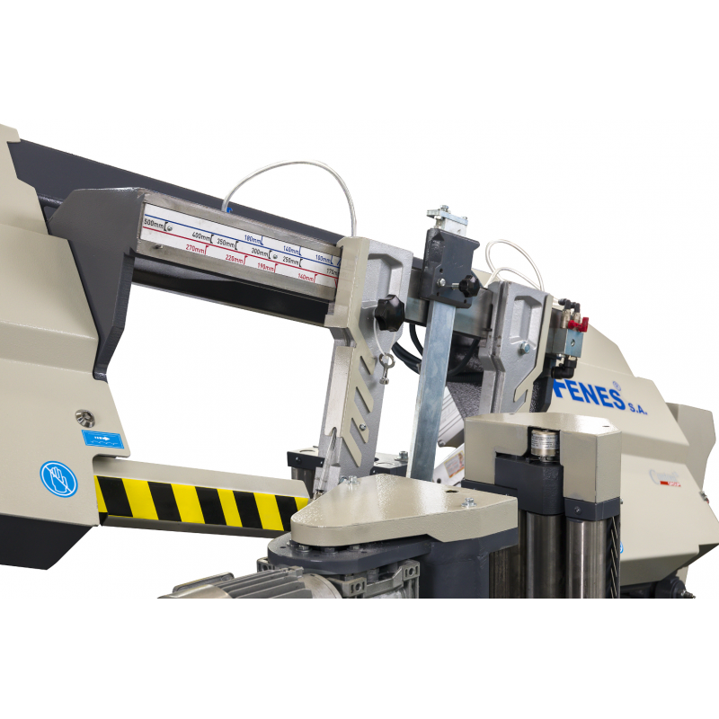 Avec les tronçonneuses automatiques FENES, une fois l'interrupteur allumé, tout le cycle de coupe, c'est-à-dire le serrage du matériau à couper dans l'étau hydraulique, l'activation du mouvement de la bande de coupe, l'avancement du matériau, l'abaissement du bras de coupe (vitesse réglable), l'arrêt de la machine après la coupe, la remontée du bras (élévation du bras réglable) et la désactivation de l'étau hydraulique, s'effectue automatiquement. La sécurité pendant le processus de coupe est assurée par une installation électrique qui répond à toutes les exigences de la CE.