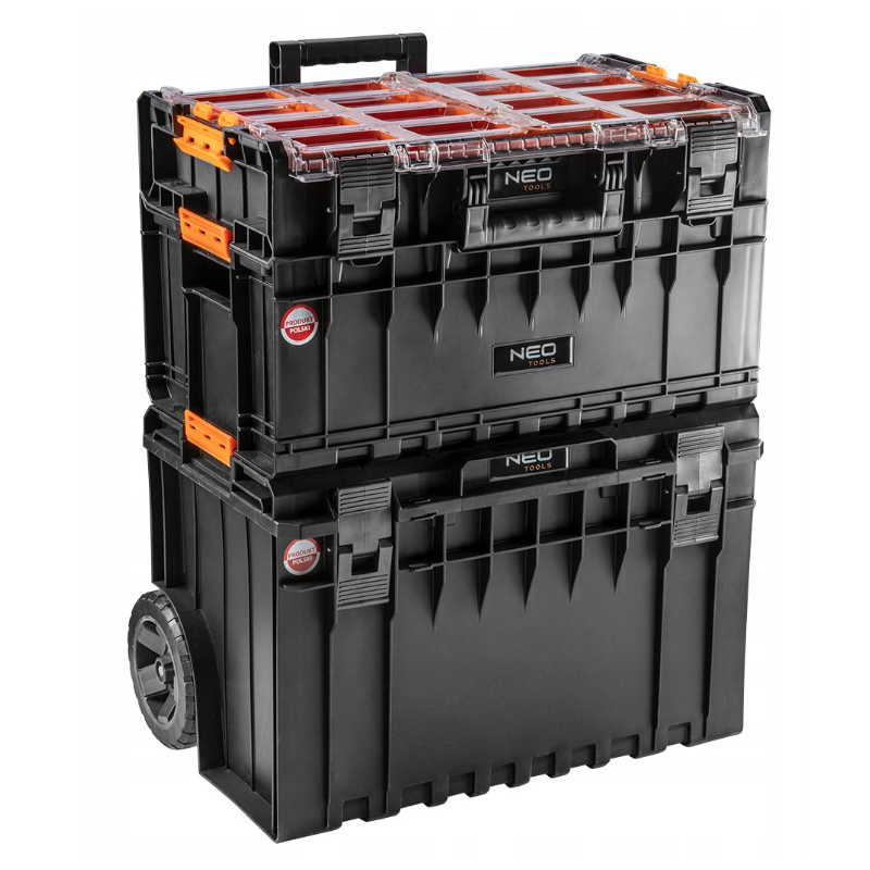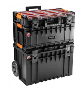 NEO System (rif. 84-278) è una struttura stabile a tre moduli su un box con ruote e maniglia telescopica per il trasporto e lo stoccaggio degli attrezzi da costruzione. La struttura molto robusta consente di trasportare molti attrezzi pesanti. La scatola aperta consente di trasportare utensili più grandi o più lunghi se posizionata come la prima scatola. L'organizzatore è ideale per trasportare e riporre accessori come viti, dadi o tasselli. I moduli hanno molti vantaggi: capacità, chiusure robuste, maniglia resistente, guarnizioni nei coperchi. Sono resistenti alla polvere e all'acqua. NEO Il marchio soddisfa le aspettative dei professionisti.