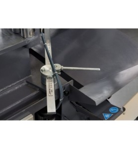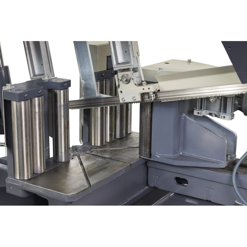 Sega a nastro elettronica di nostra produzione. La macchina è dotata di un meccanismo di sollevamento automatico della testa al termine del taglio. La morsa idromeccanica viene aperta e chiusa dal pannello di controllo. L'alimentazione del materiale è manuale o automatica al termine del taglio. Grazie al pannello di controllo, è possibile impostare il ciclo del numero di tagli desiderato. In modalità automatica, la macchina taglia e alimenta autonomamente il materiale fino al raggiungimento del numero di tagli preimpostato. La macchina consente il taglio obliquo su un solo lato. Grazie all'uso di un inverter, è possibile controllare continuamente la velocità della sega a nastro.
